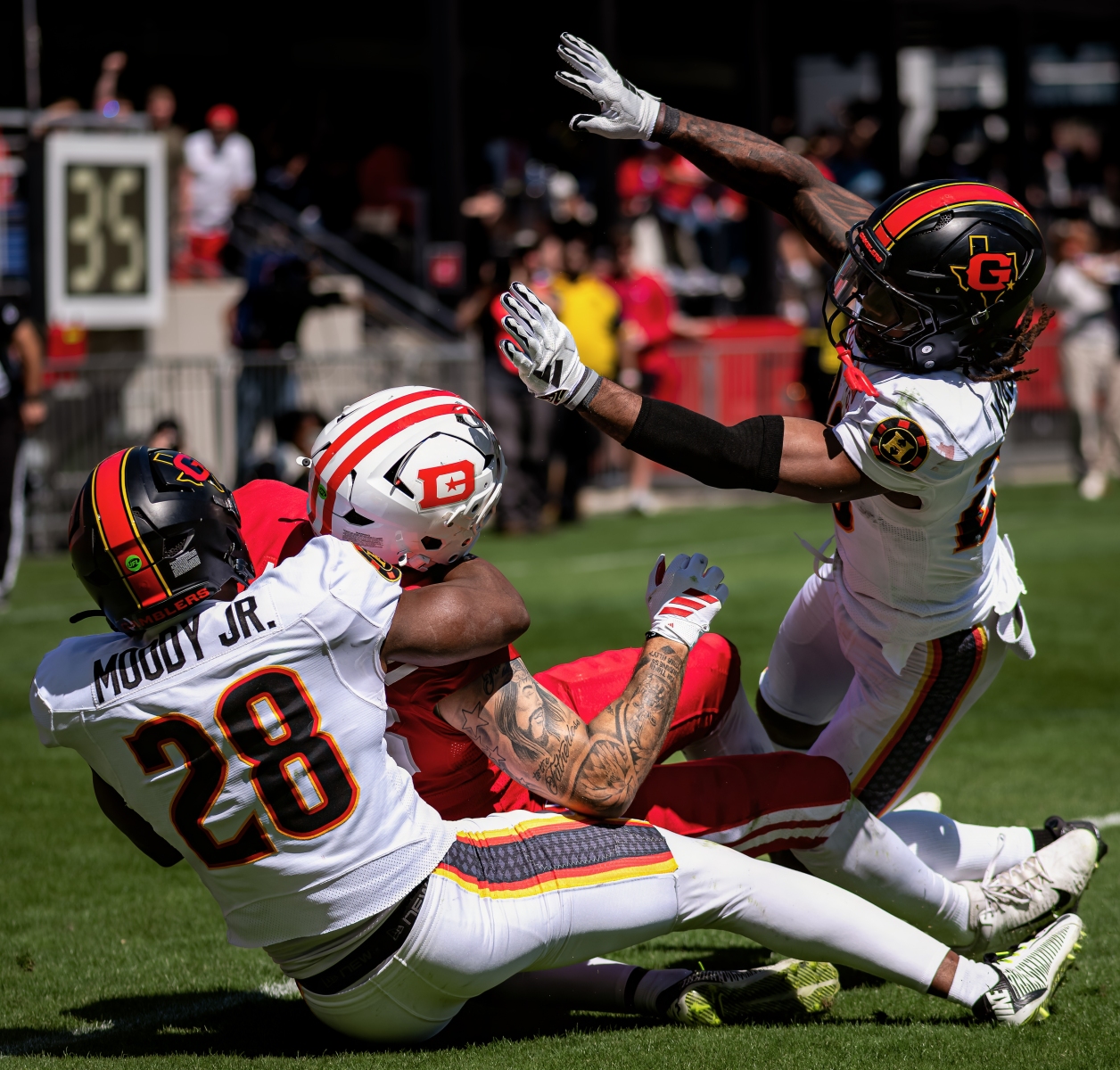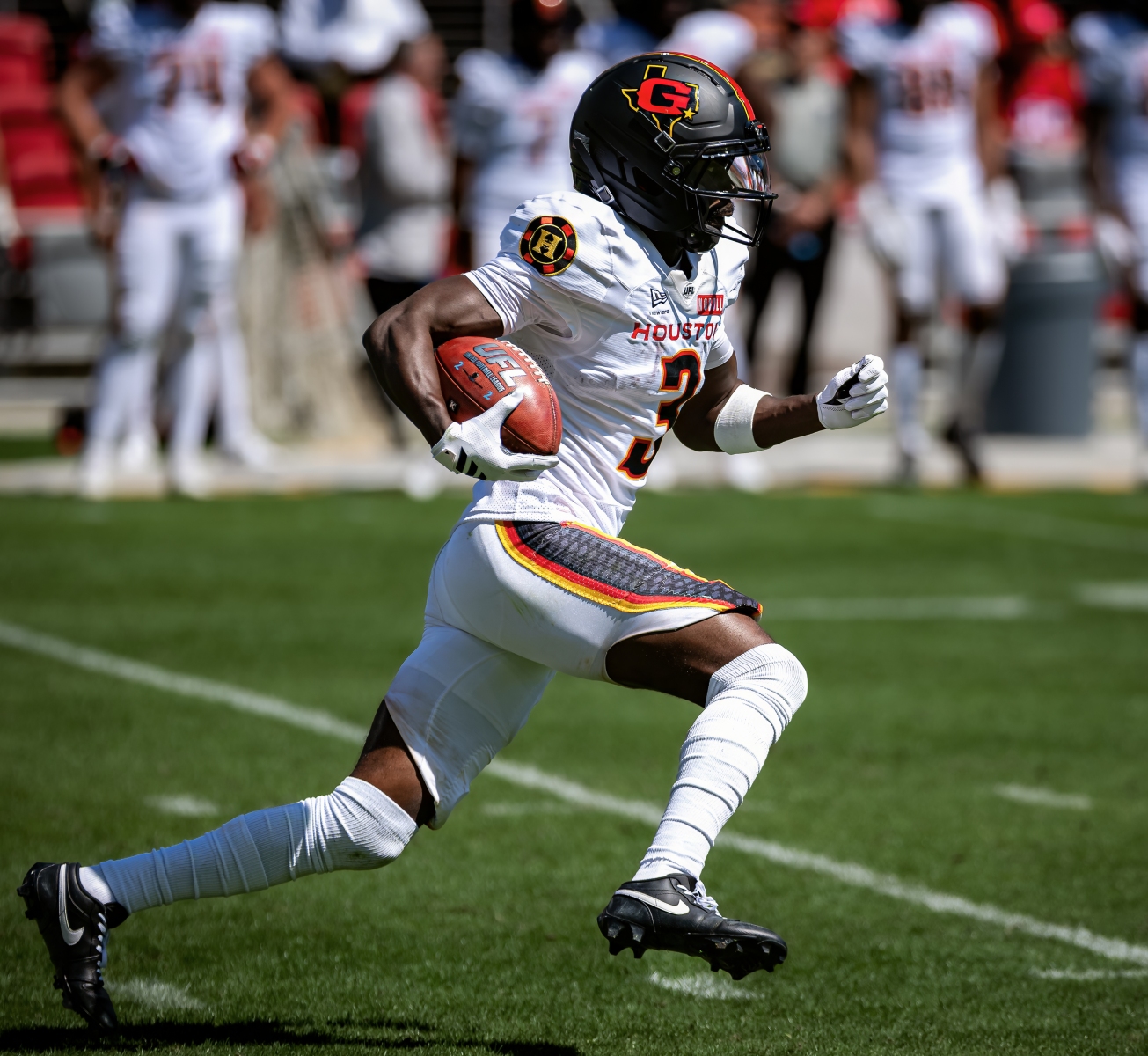 Second Quarter: Houston’s offense kept digging its own grave. Ta’amu was picked off by Major Burns in the end zone, but the Gamblers couldn’t capitalize — Tagovailoa fumbled on a fourth-and-short keeper, and Bryce Thompson scooped it up for DC. McCrane connected from 46 yards to push the lead to 14-0. Conley then intercepted Tagovailoa and returned it 70 yards to the house — 21-0. The coup de grâce came at the two-minute warning: offensive coordinator Fred Kaiss called a fullback trick play, Ta’amu rolled right to draw the defense, and Briley Moore slipped out left completely untouched into the end zone. DC went to halftime up 28-0 — the largest halftime lead in UFL history.