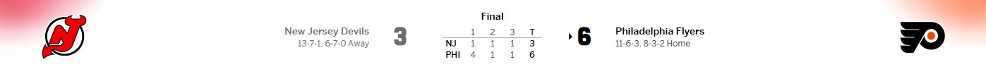 Dan Vladar made 32 saves for Philadelphia (11-6-3), which has won three of four. Allen stopped 23 shots but was beaten six times for New Jersey (13-7-1), which dropped its third straight to close a disappointing 2-3-0 road trip.