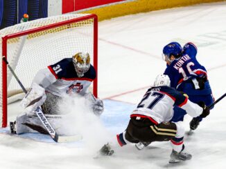 The Wolf Pack spoiled Shepard’s bid for a shutout with goals from Jake Leschyshyn at 17:02 and Anton Blidh at 19:11, with Blidh’s tally coming with Garand pulled for an extra attacker.