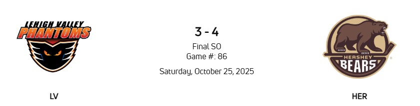 Final Score: Hershey Bears 4, Lehigh Valley Phantoms 3 (SO)