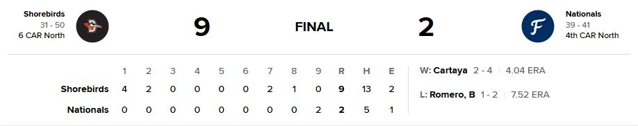 The Delmarva Shorebirds closed out their road series in emphatic fashion, cruising to a 9–2 victory over the Fredericksburg Nationals at Virginia Credit Union Stadium. Powered by early offense and a stellar outing from starter Yeiber Cartaya, Delmarva snapped Fredericksburg’s four-game win streak and claimed the finale with authority.